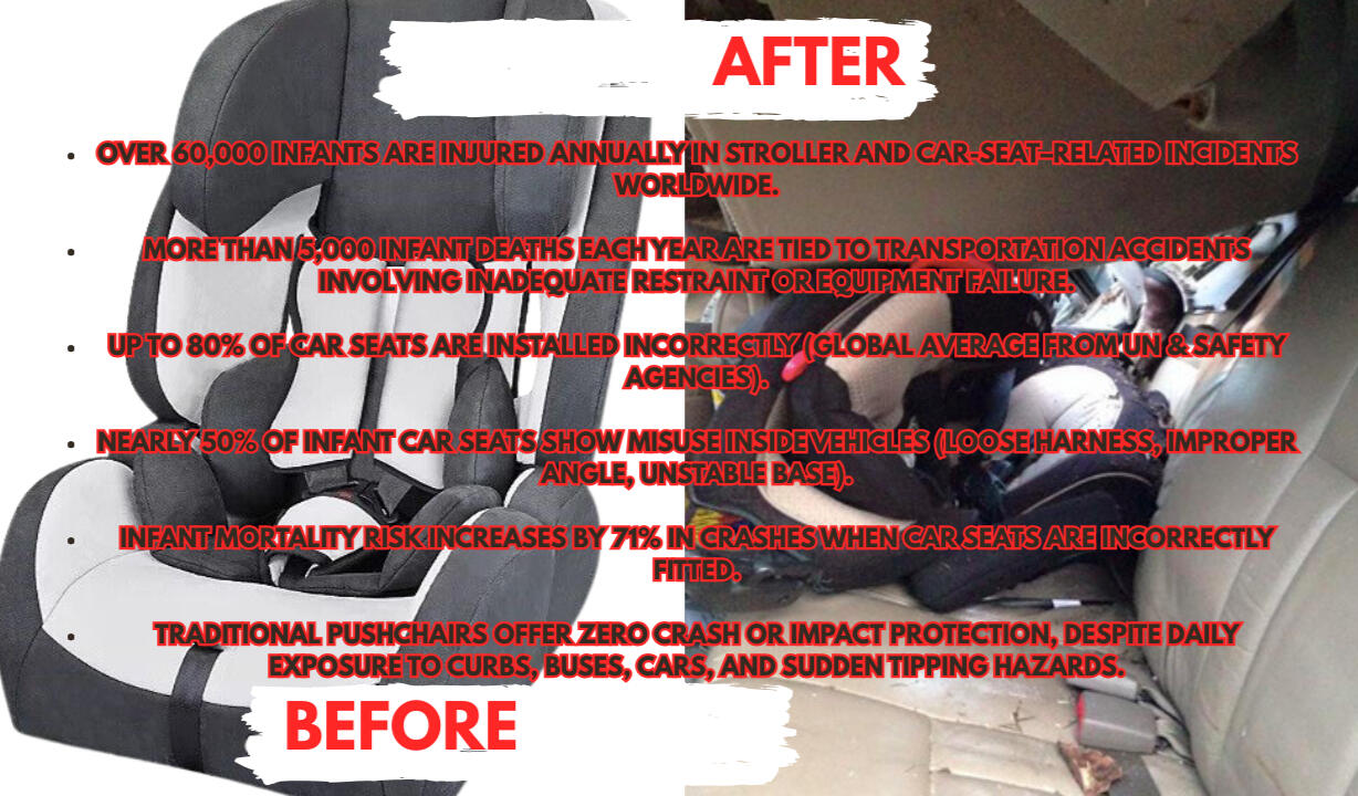Over 60,000 infants are injured annually in stroller and car-seat–related incidents worldwide.More than 5,000 infant deaths each year are tied to transportation accidents involving inadequate restraint or equipment failure.Up to 80% of car seats are installed incorrectly (global average from UN & safety agencies).Nearly 50% of infant car seats show misuse inside vehicles (loose harness, improper angle, unstable base).Infant mortality risk increases by 71% in crashes when car seats are incorrectly fitted.Traditional pushchairs offer zero crash or impact protection, despite daily exposure to curbs, buses, cars, and sudden tipping hazards.